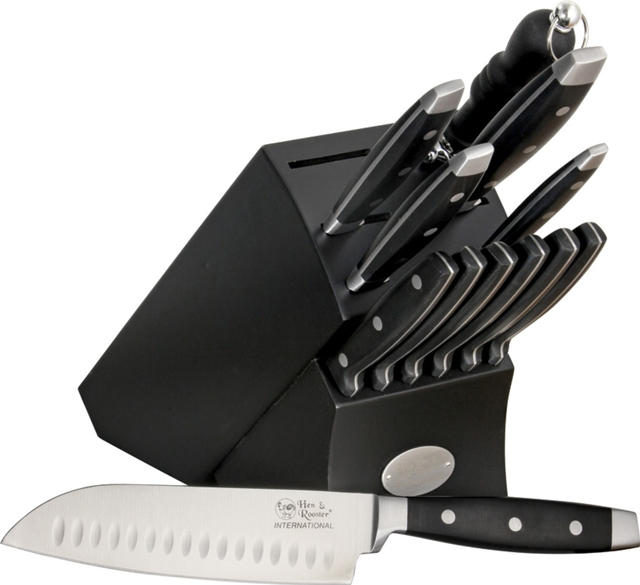 Hen & Rooster Kitchen Block Set, 13 Piece Cutlery Set w/Natural Wood Counter Block with Black Finish