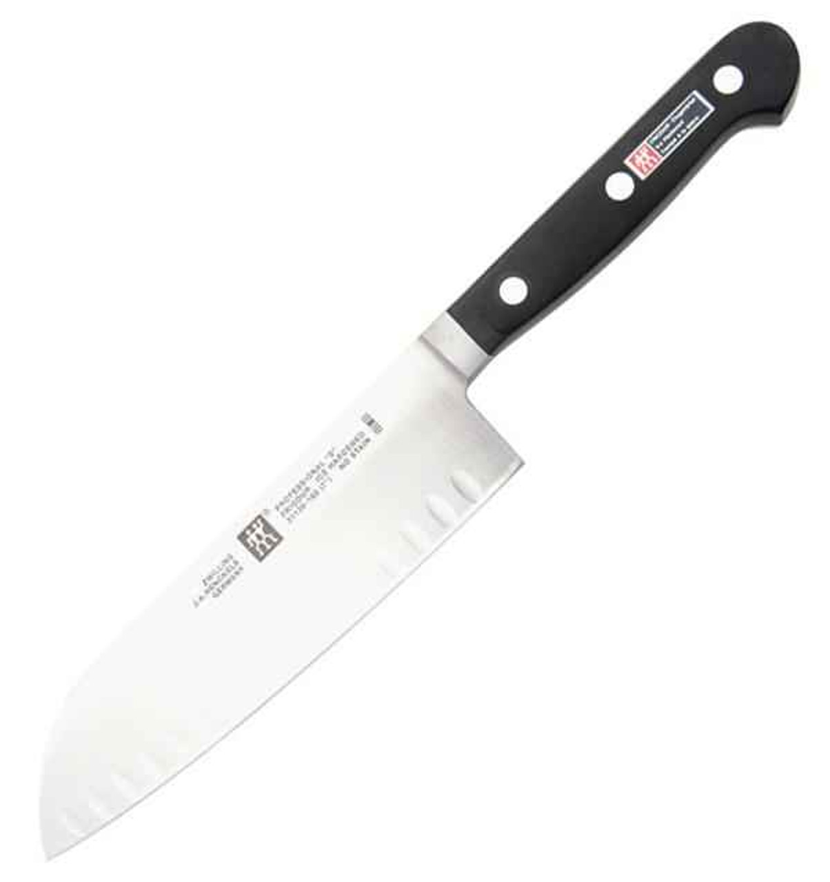 Henckels Pro S Santoku. 7″ granton blade. Pro S Series. Knives in this series feature forged ice hardened stainless blades, full tang construction and black hygienic Novodur handles with stainless steel rivets.