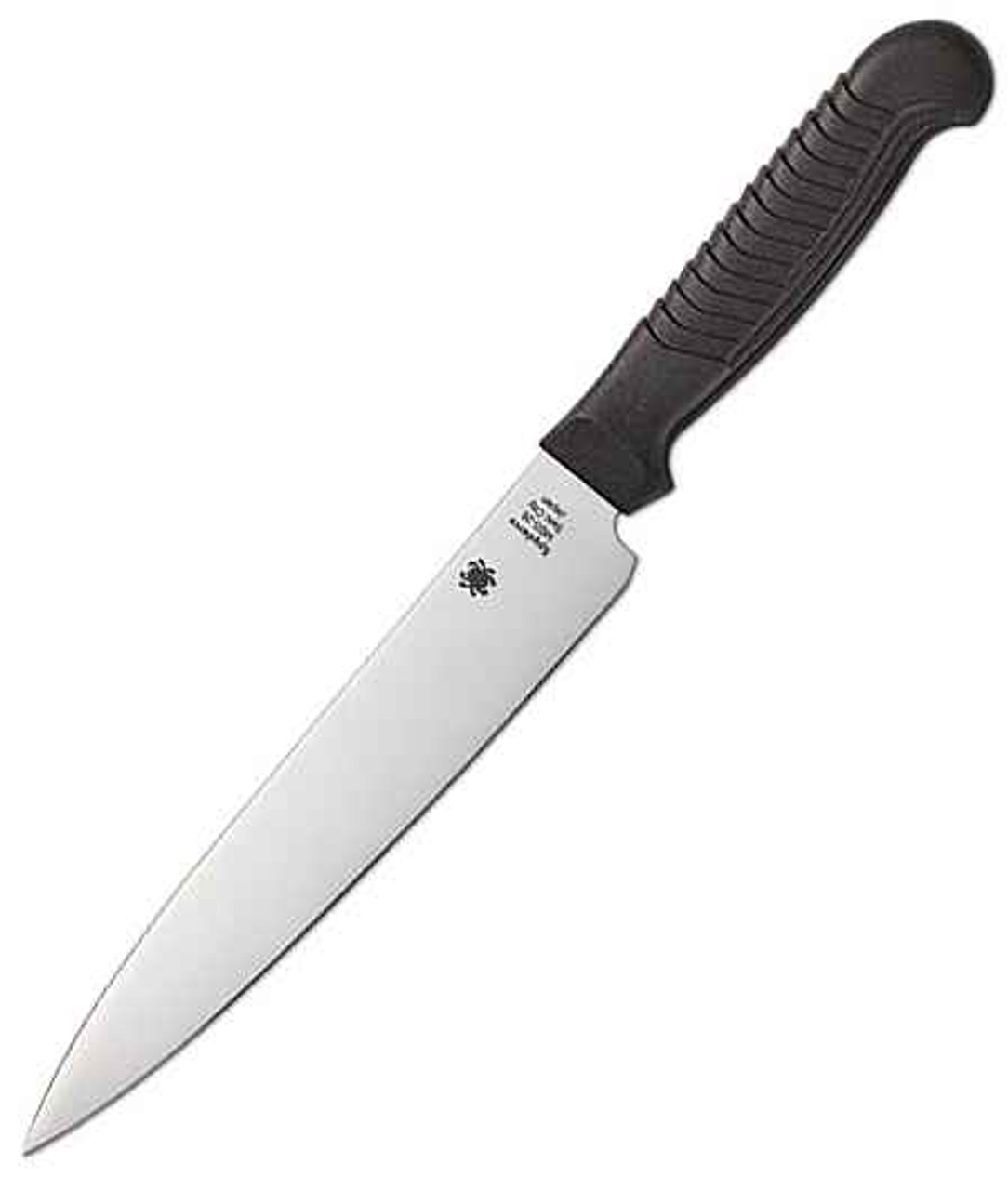 Spydercos involvement in kitchen knives dates back to the early 1980s and the beginnings of the companys knife production. After being discontinued a number of years ago, they are now back by popular demand and better than ever. Our current kitchen knives combine all the distinctive features of the originals with an improved handle material that offers increased durability. The K04 Utility Knife has a 6.5-inch drop-point blade that is ideal for a broad range of kitchen cutting chores, making it the most popular go-to knife in many home and commercial kitchens. Like the original version, it features a premium MBS-26 stainless steel blade, ground exceptionally thin and meticulously heat treated for optimal cutting performance. Its durable polypropylene plastic handle is injection molded directly onto the tang of the blade and features a distinctive stepped texture pattern that provides exceptional comfort and control during use.